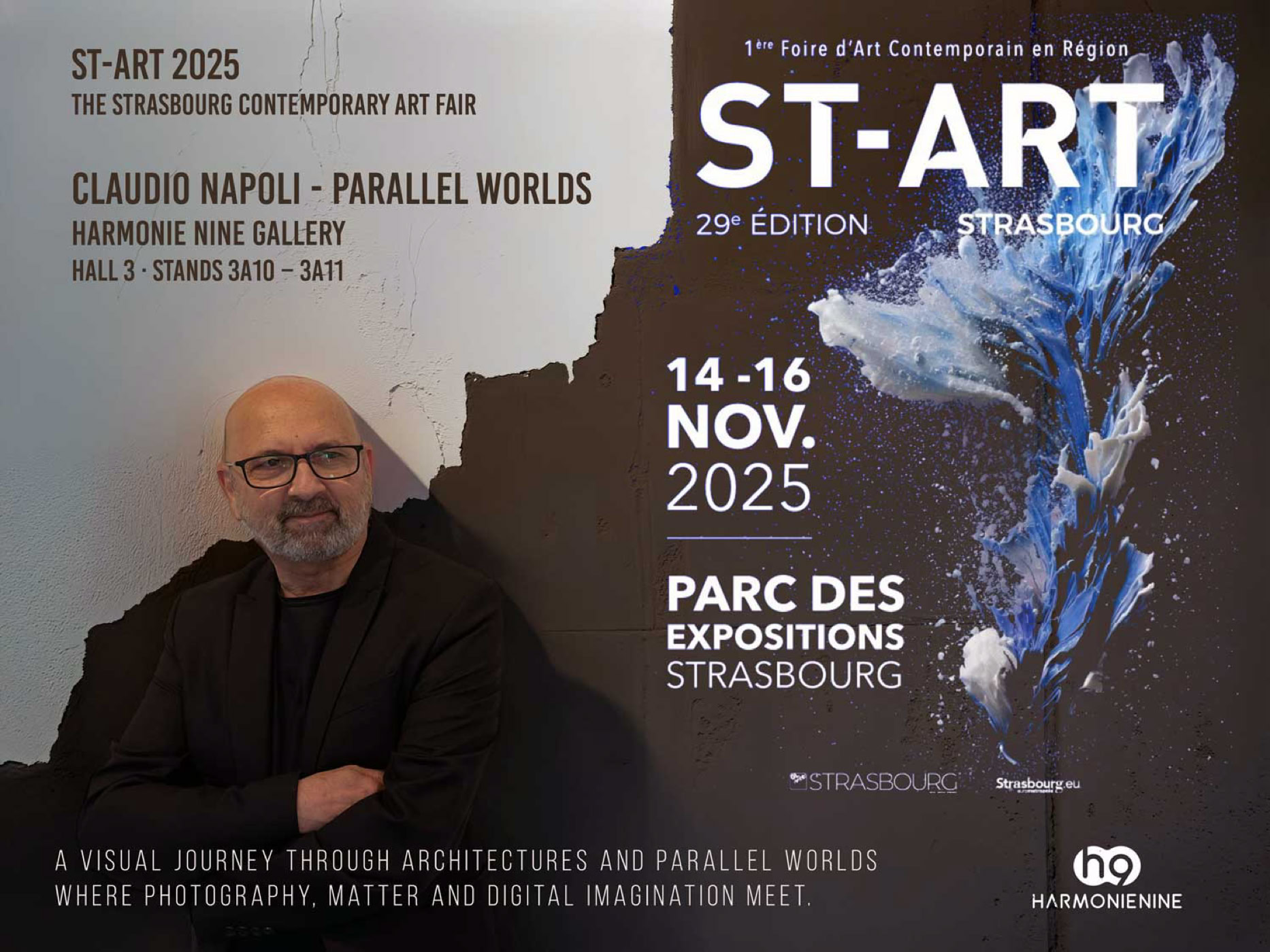 With Parallel Worlds, the artist explores the possibility of constructing alternative worlds starting from fragments of the real. His language merges photography, architecture, and digital imagination in a refined balance between abstraction and materiality, between urban memory and inner vision.